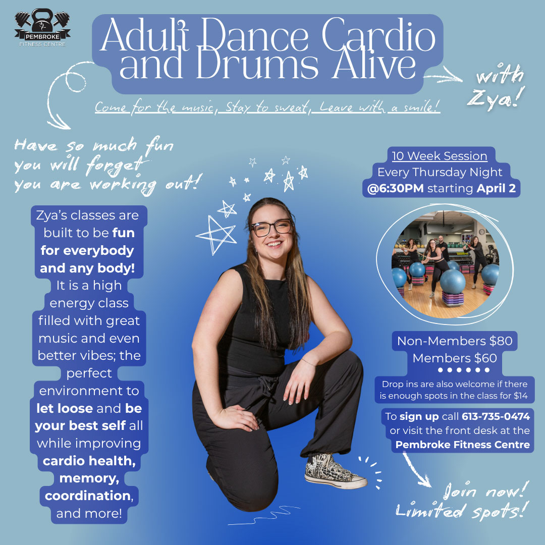 To book Drums Alive please contact the Pembroke Fitness Centre 613-735-0474.